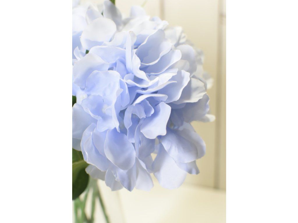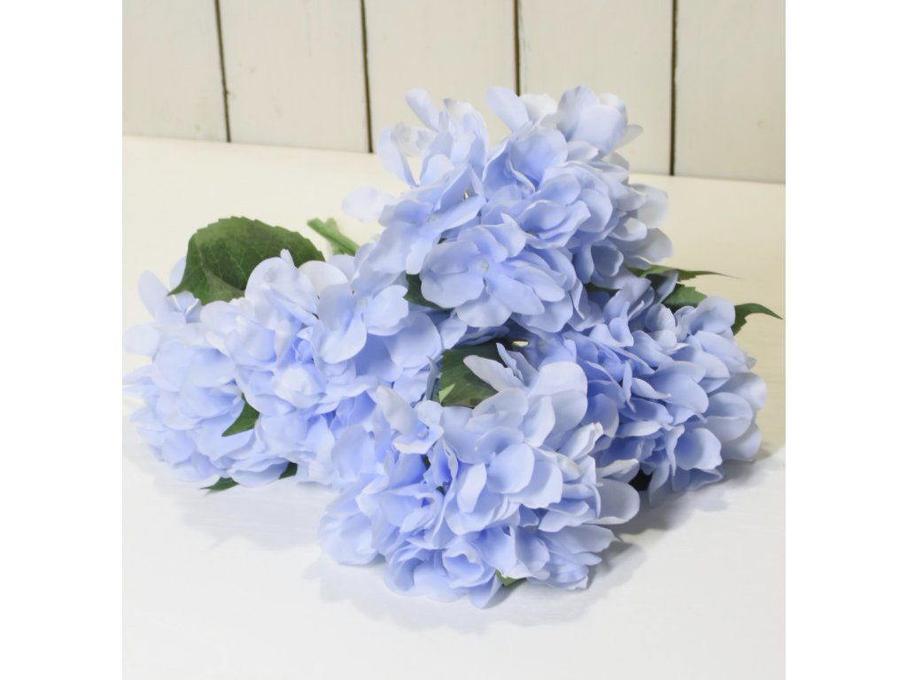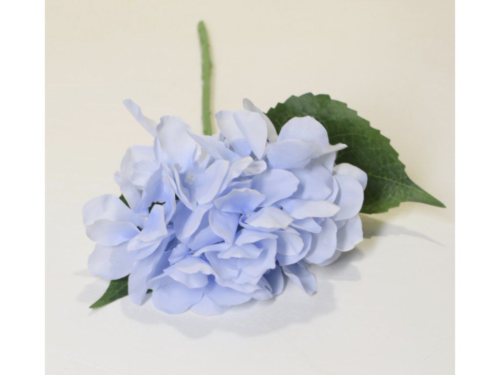 Látková hortenzie ve světlounce modré barvě. Květ cca 15 x 15 cm, dva listy. Délka 34cm.