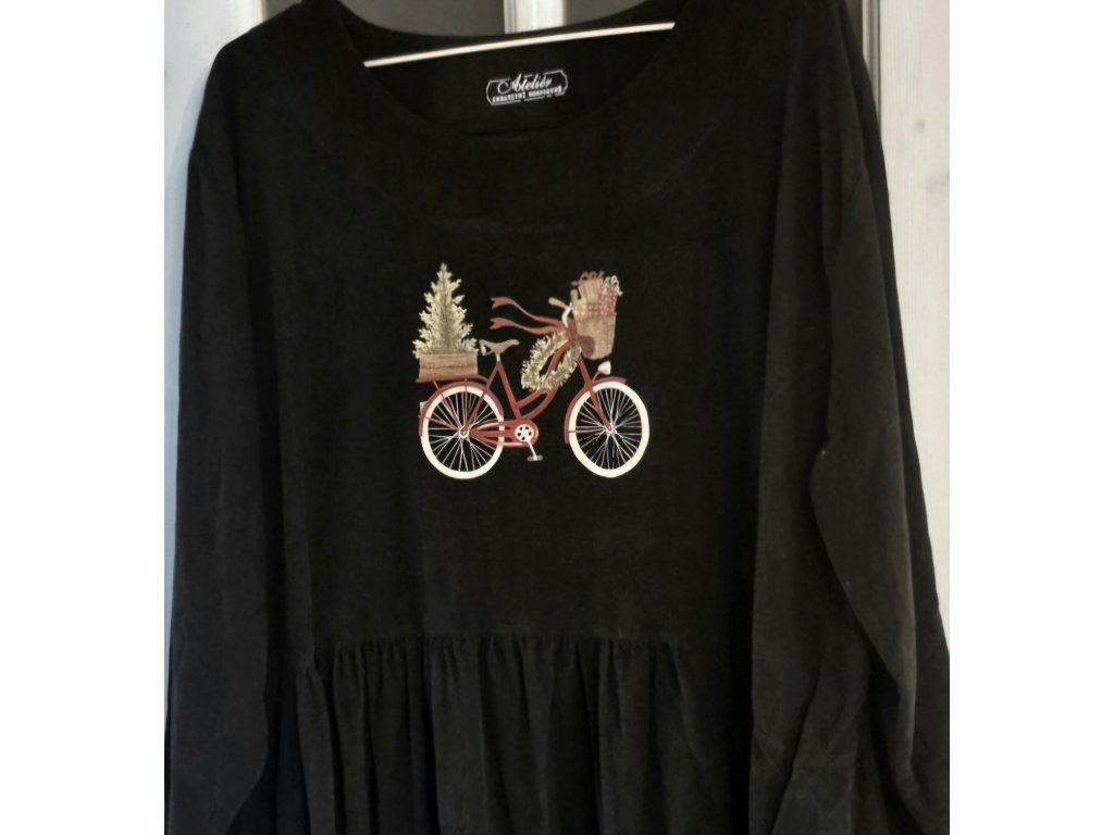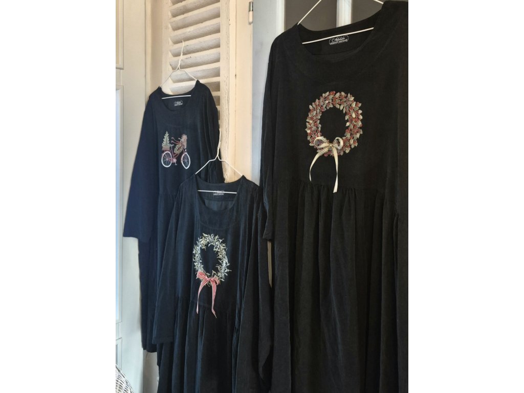 Délka cca 110cm, délka rukávu od krku cca 68cm, šířka šatů ve spodní části cca 100 cm, přes prsa cca 55 cm, šíře rukávu je cca 20cm.