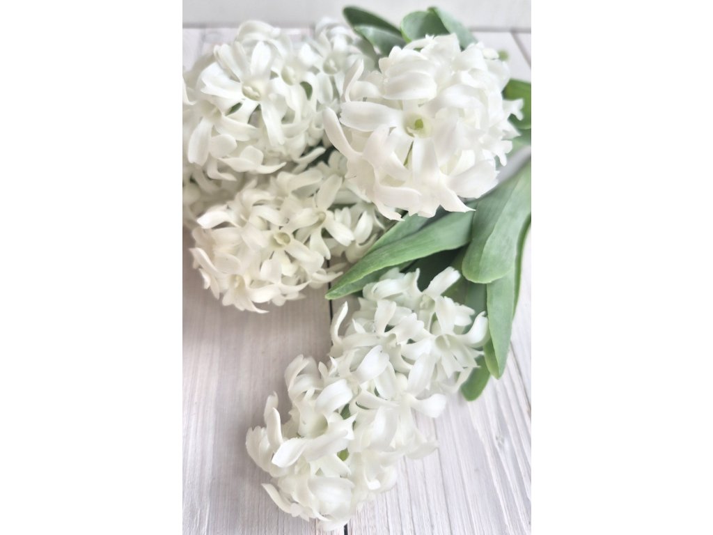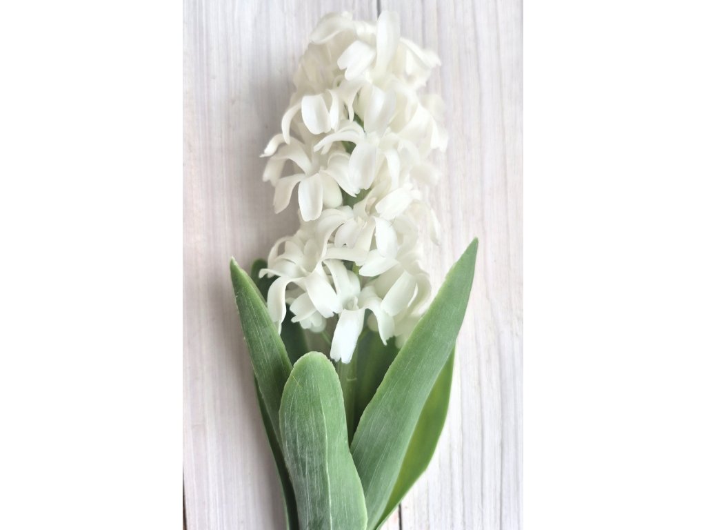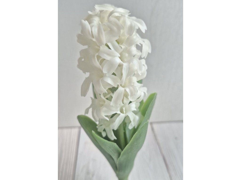 Silikonový, reálně vypadající hyacint v bílé barvě. Výška květu cca 9cm, Celková délky cca 26cm.