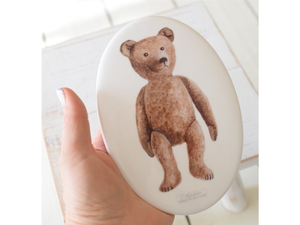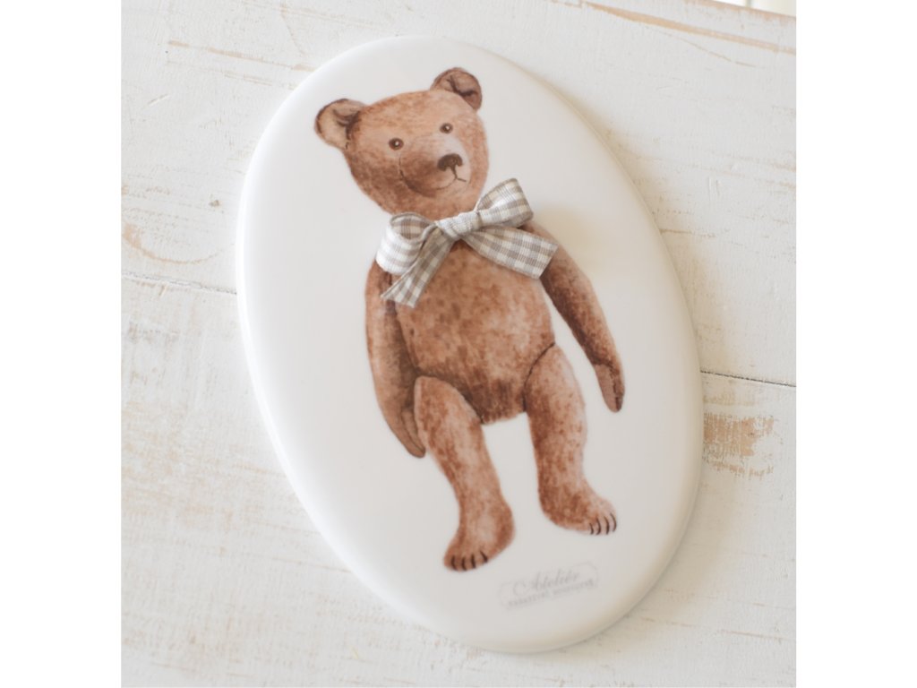 Autorský obrázek na keramickém oválu 10,5x15 cm. Motiv medvěda si můžete doladit mašlí.