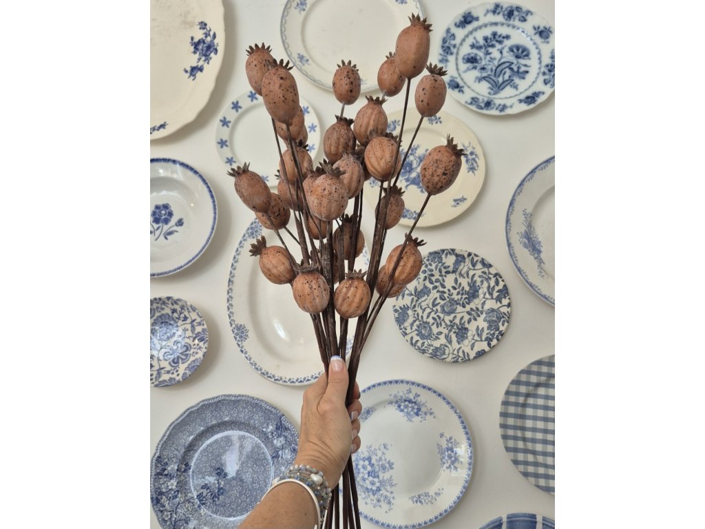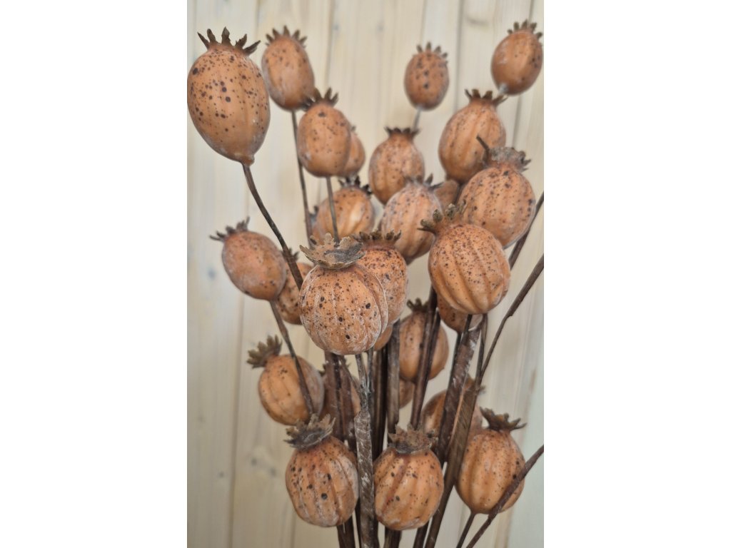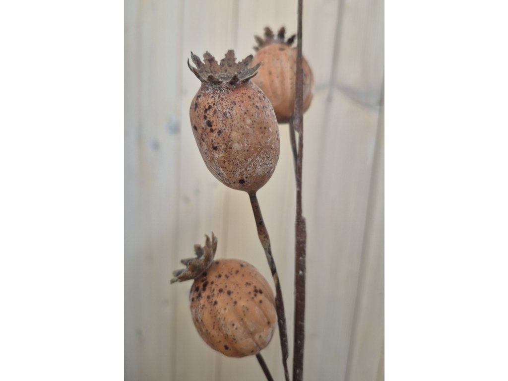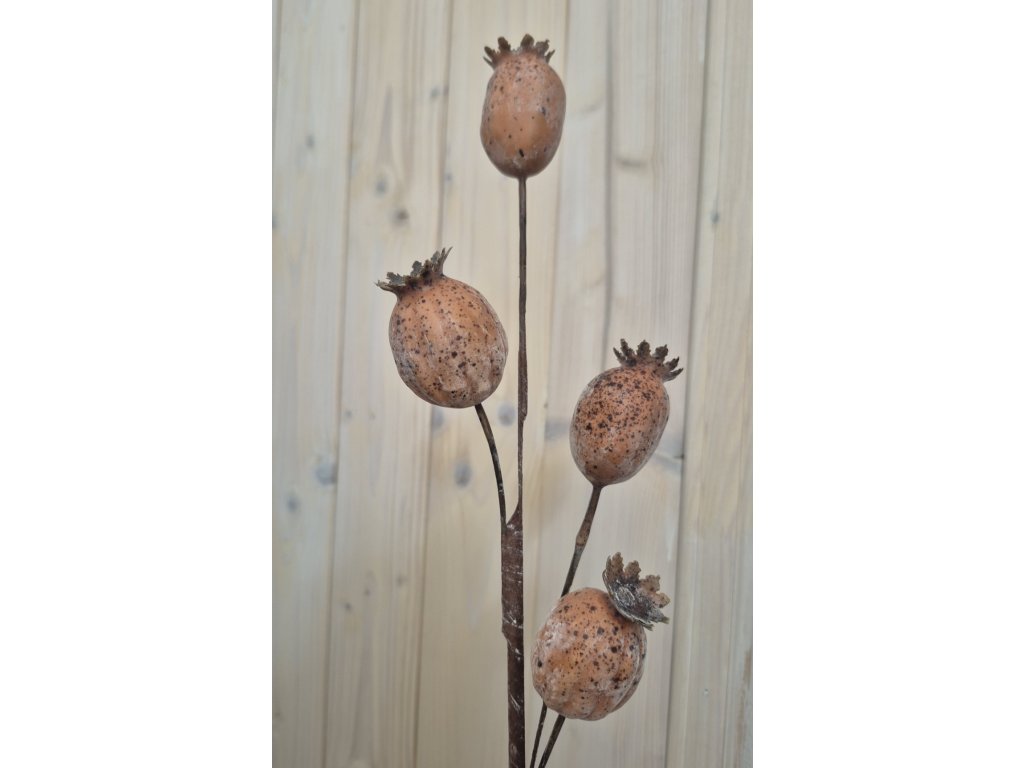 Makovice, 4ks na větvičce, délka cca 63cm, jednotlivé makovice výška cca 4-4,5 cm. Hezké barevné provedení.