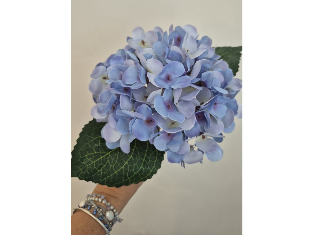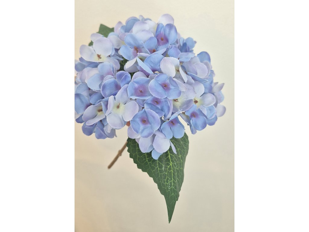 Látková hortenzie v modré barvě. Květ cca 18 x 18 cm, hezky propracovaný list. Délka 34cm.