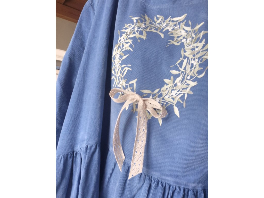 Délka cca 110cm, délka rukávu od krku cca 68cm, šířka šatů ve spodní části cca 100 cm, přes prsa cca 55 cm, šíře rukávu je cca 20cm.
