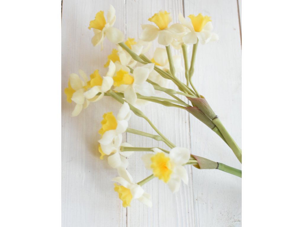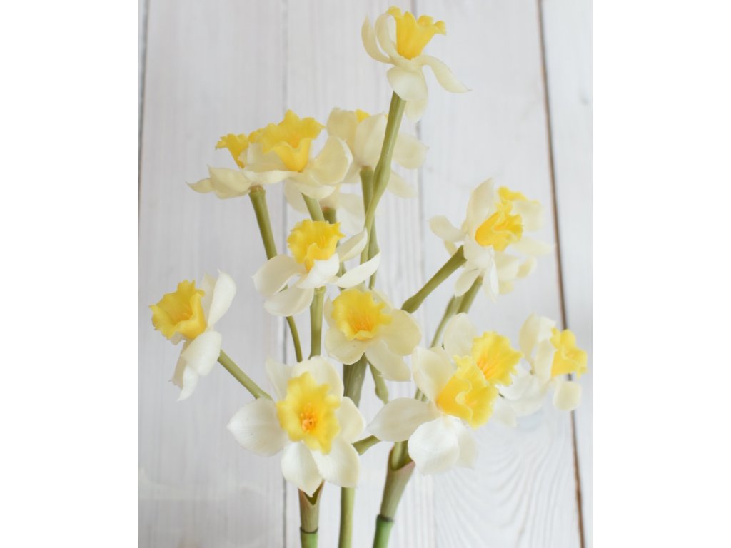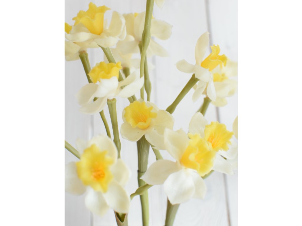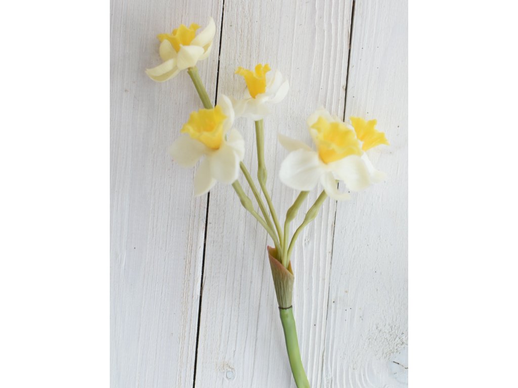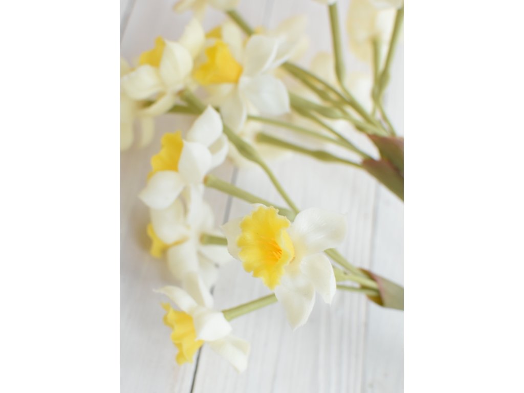 Větvička reálně vypadajících narcisů. Pět silikonových květů na propracovaném stonku. Délka cca 50cm, průměr květu cca 6cm.