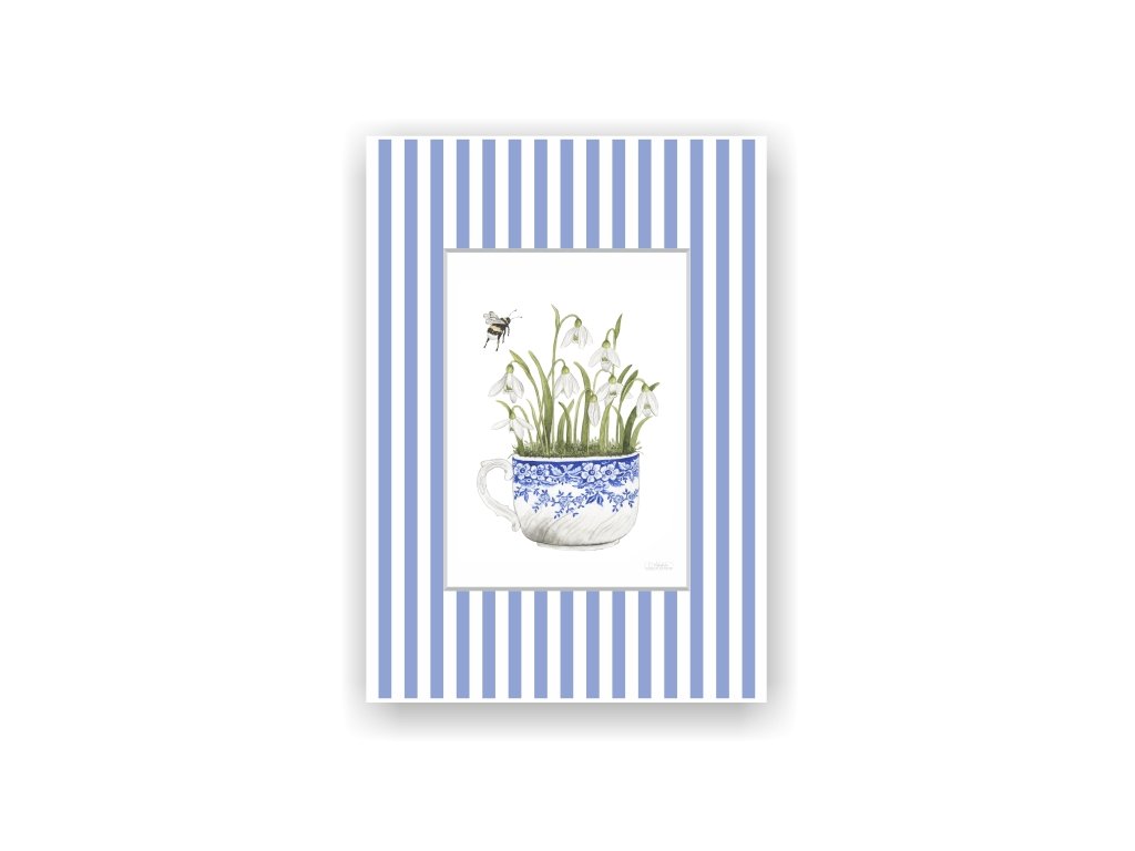 Kvalitní reprodukce na papíru vyšší gramáže. Autorský obrázek v tištěné pruhované paspartě. Ve spodní části je decentní značka Ateliéru KREATIVNÍ HOSPODYNĚ. K obrázku si můžete doobjednat i dřevěný rámeček.