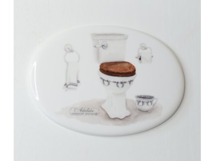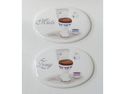 Autorské obrázky na keramických oválech 15x10,5 cm k rozlišení toalet na ženy a muže.