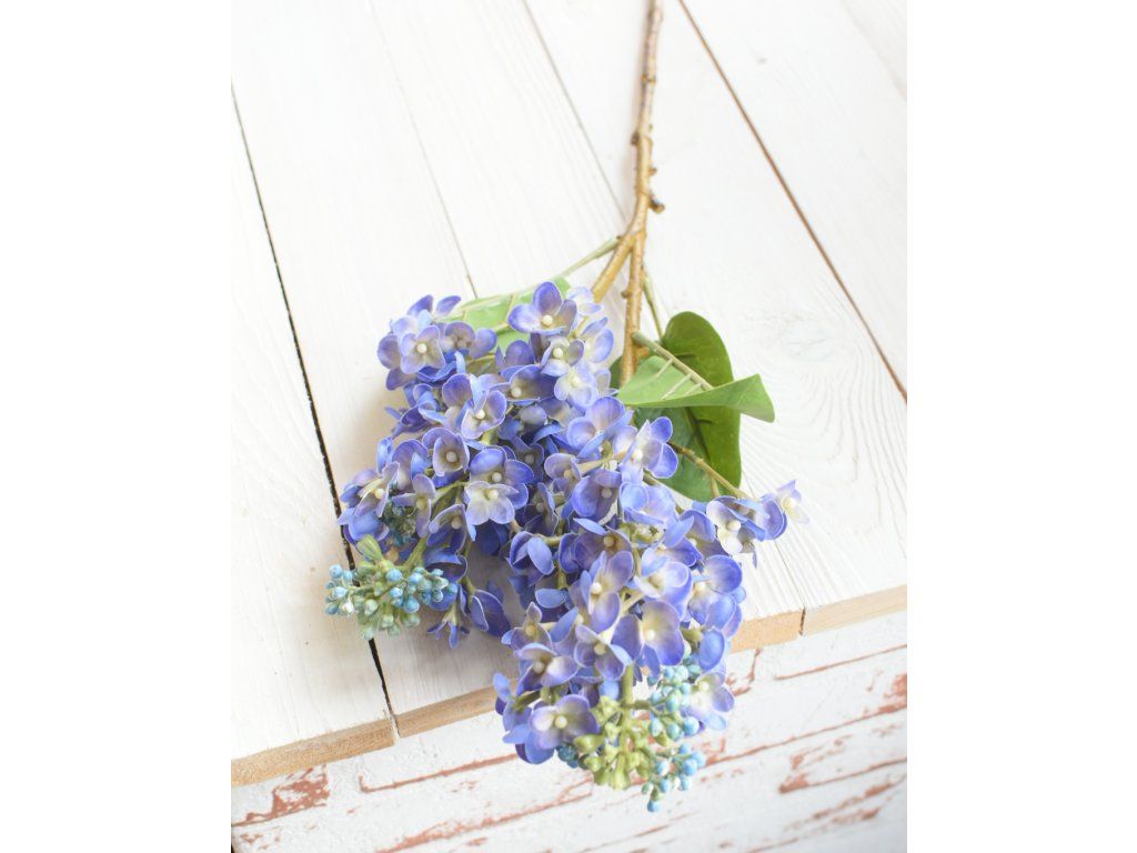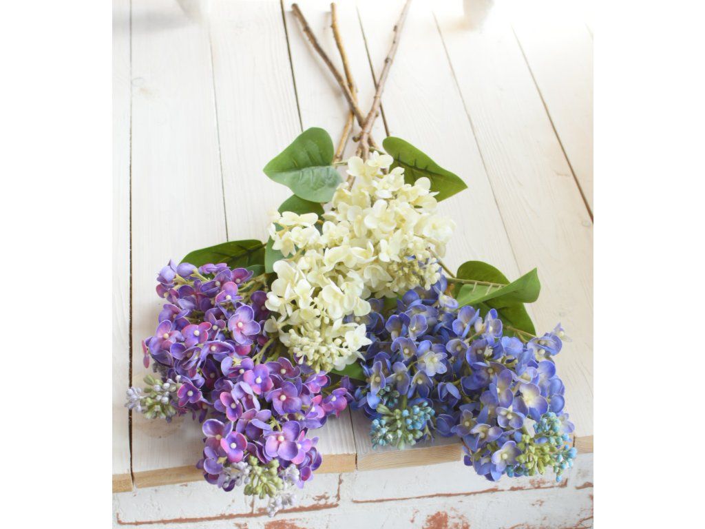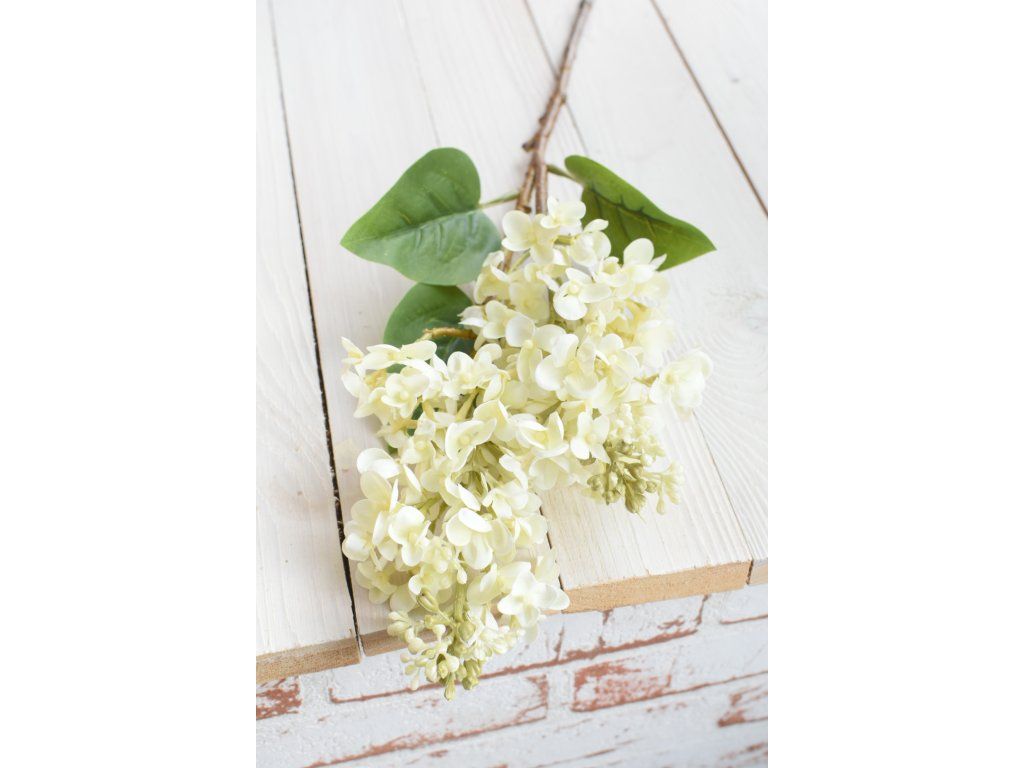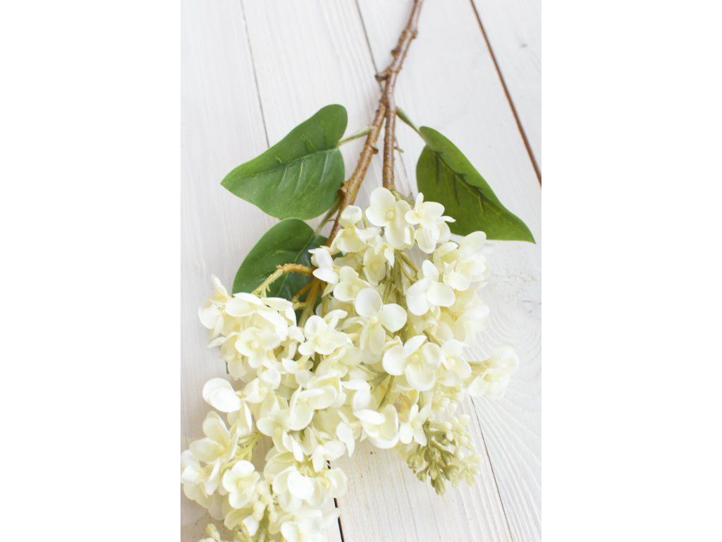 Dva velké, reálně vypadající silikonové květy šeříku na krásně zpracované větvičce, tři listy. Délka cca 67cm. Výška květu cca 16cm.