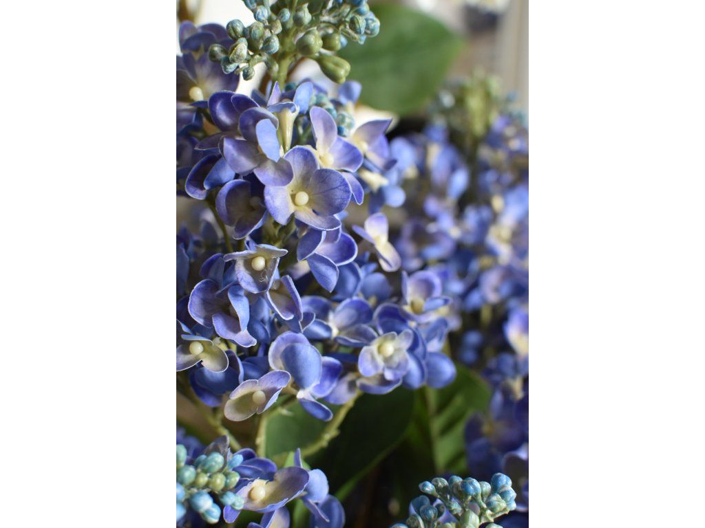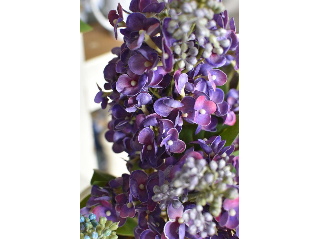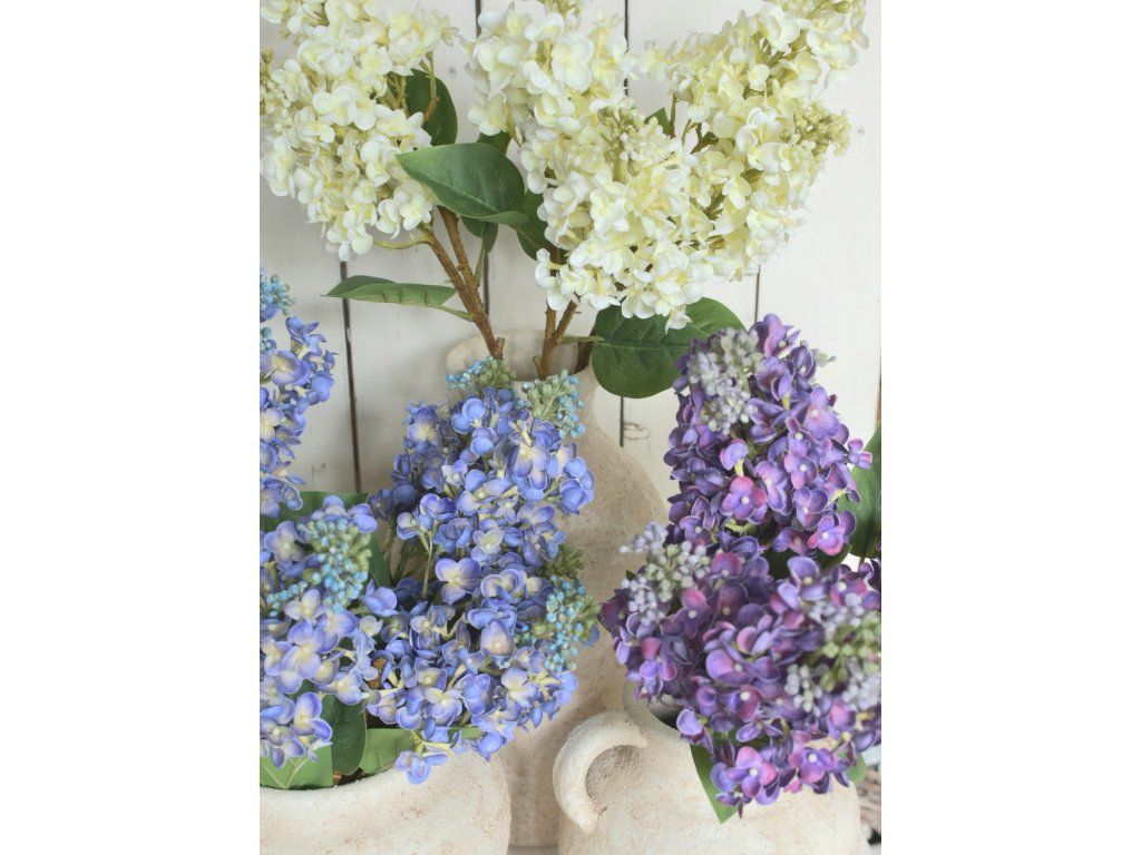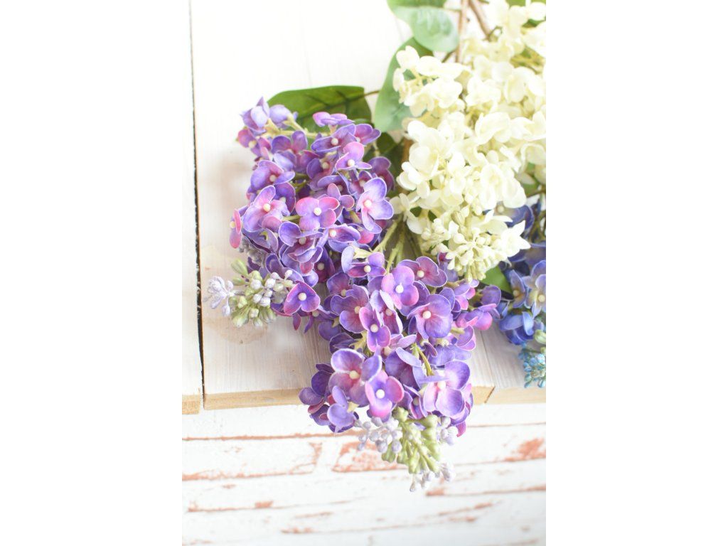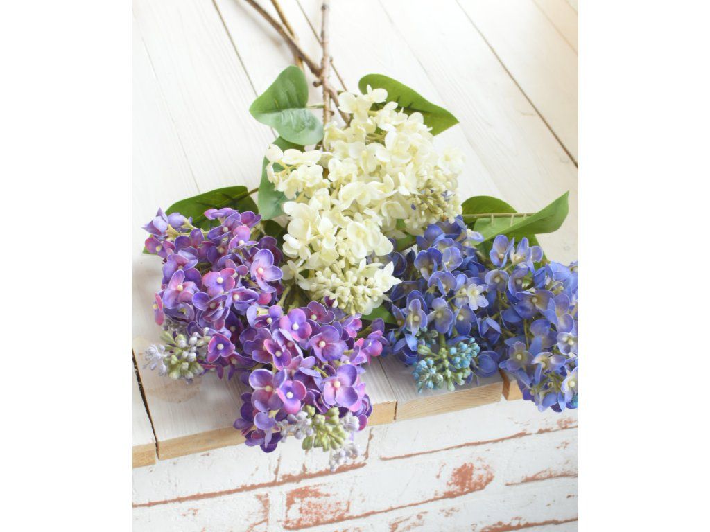 Dva velké, reálně vypadající silikonové květy šeříku na krásně zpracované větvičce, tři listy. Délka cca 67cm. Výška květu cca 16cm.