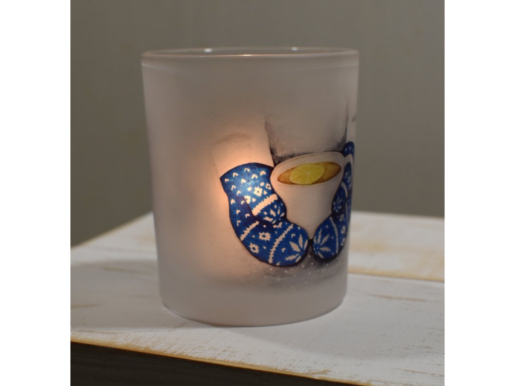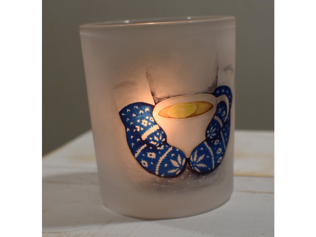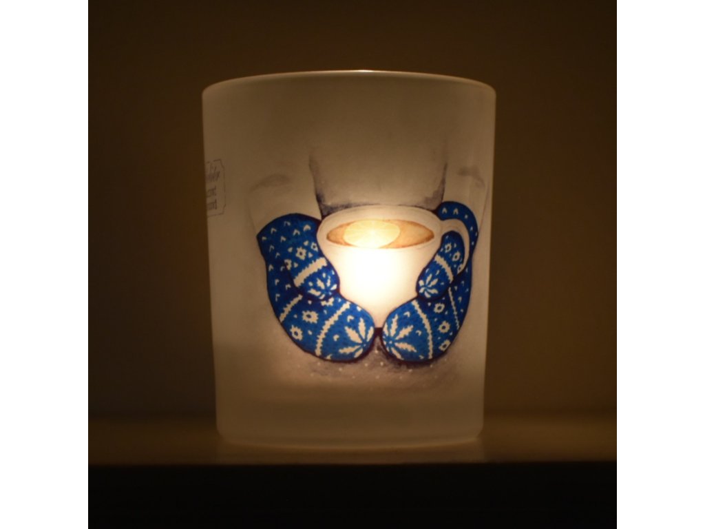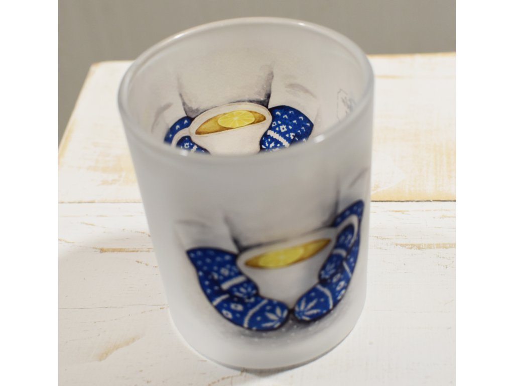 Matný skleněný svícen na čajovou svíčku s autorským obrázkem z obou stran.  Výška 8,5cm, průměr 7cm.
