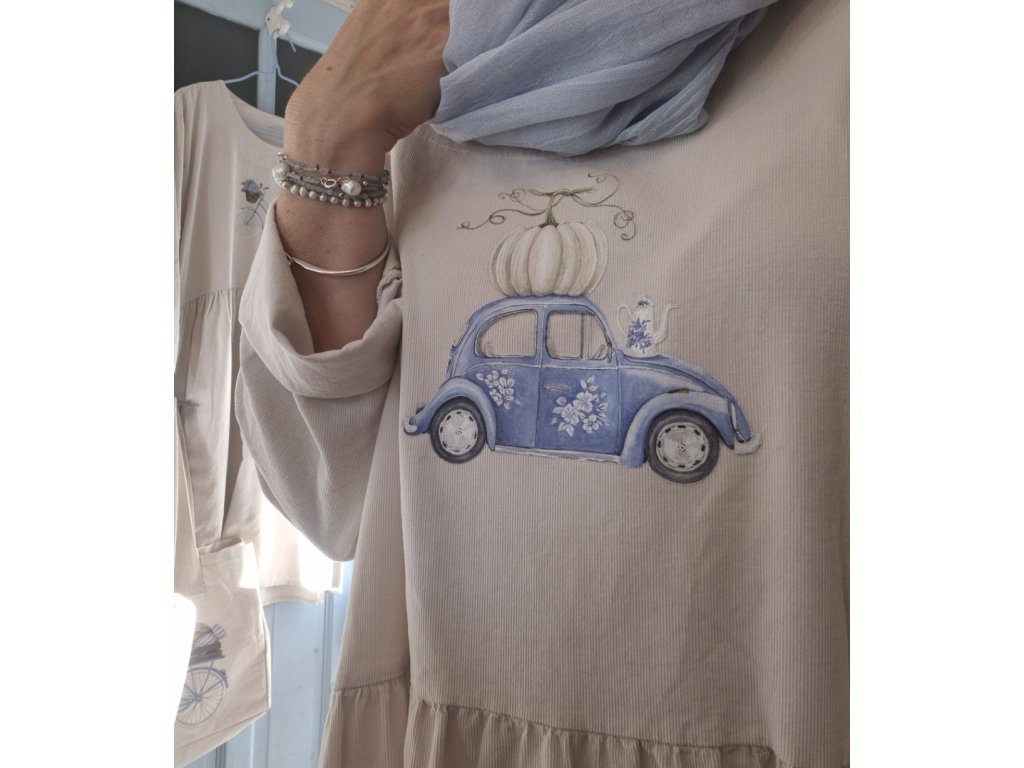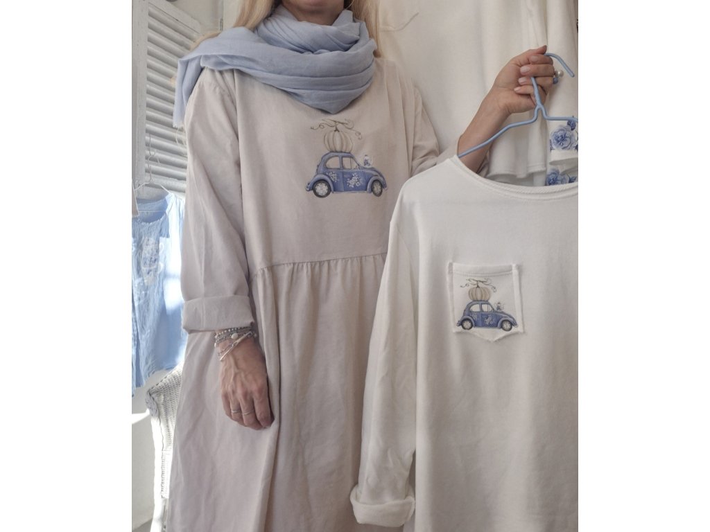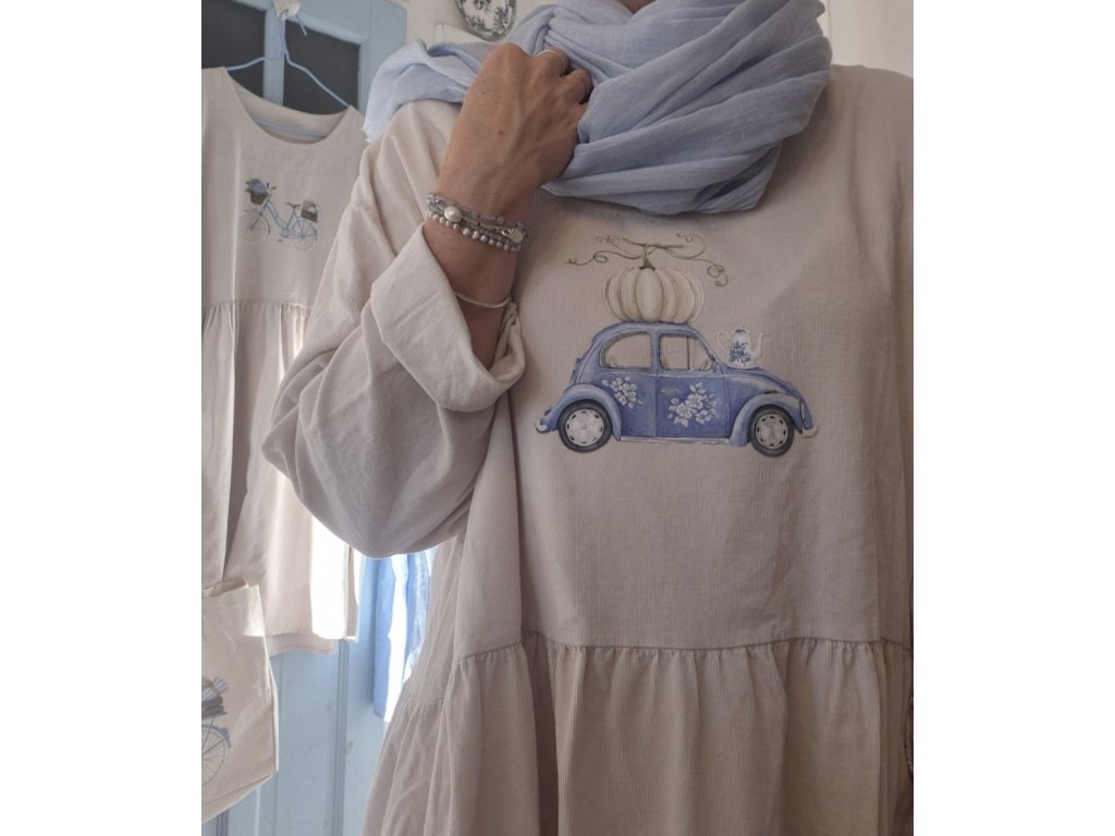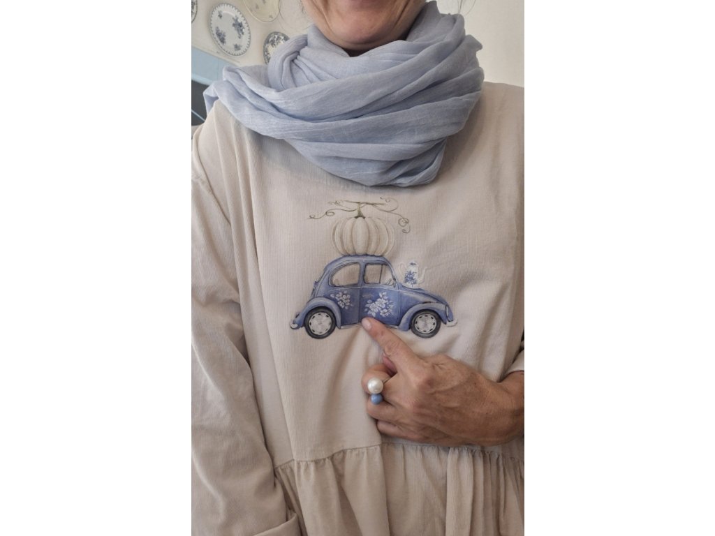 Délka cca 110cm, délka rukávu od krku cca 68cm, šířka šatů ve spodní části cca 100 cm, přes prsa cca 55 cm, šíře rukávu je cca 20cm.